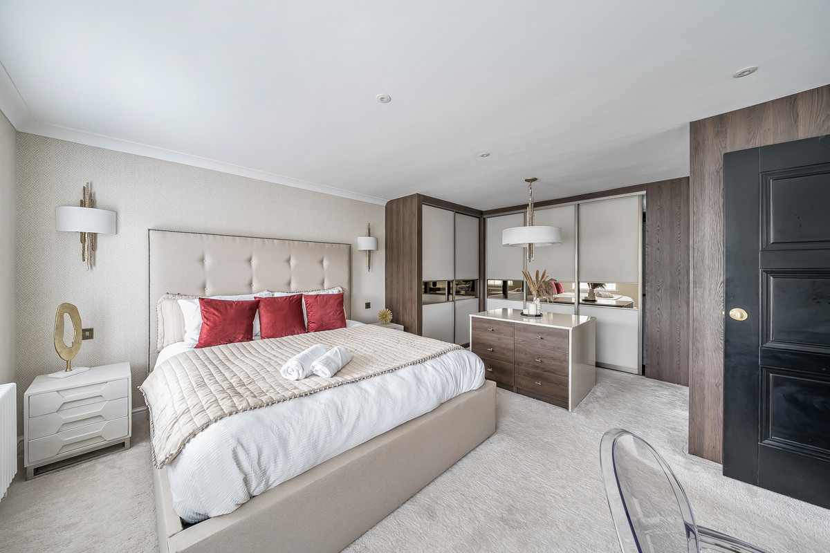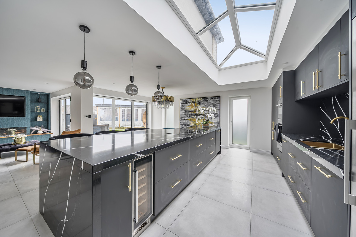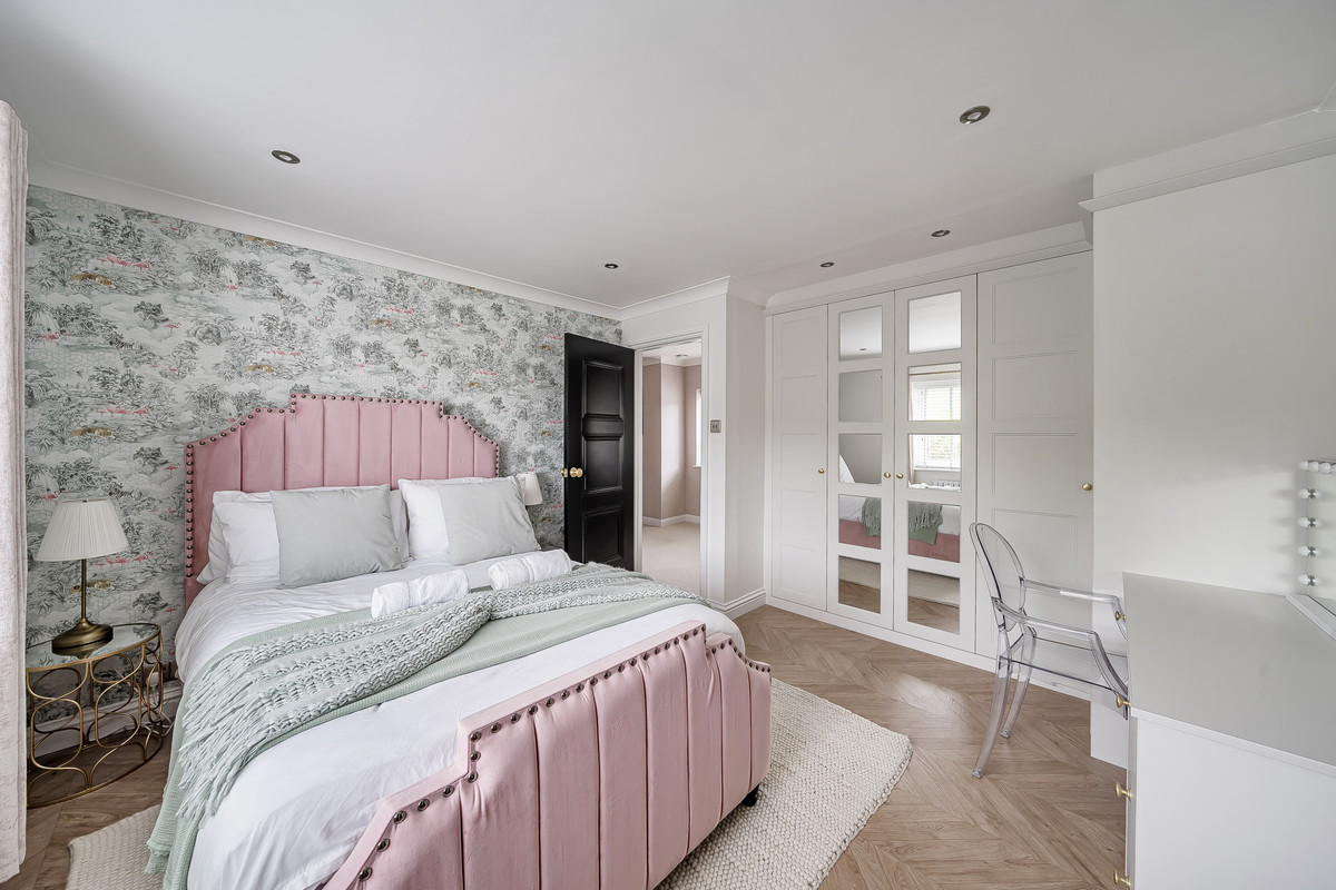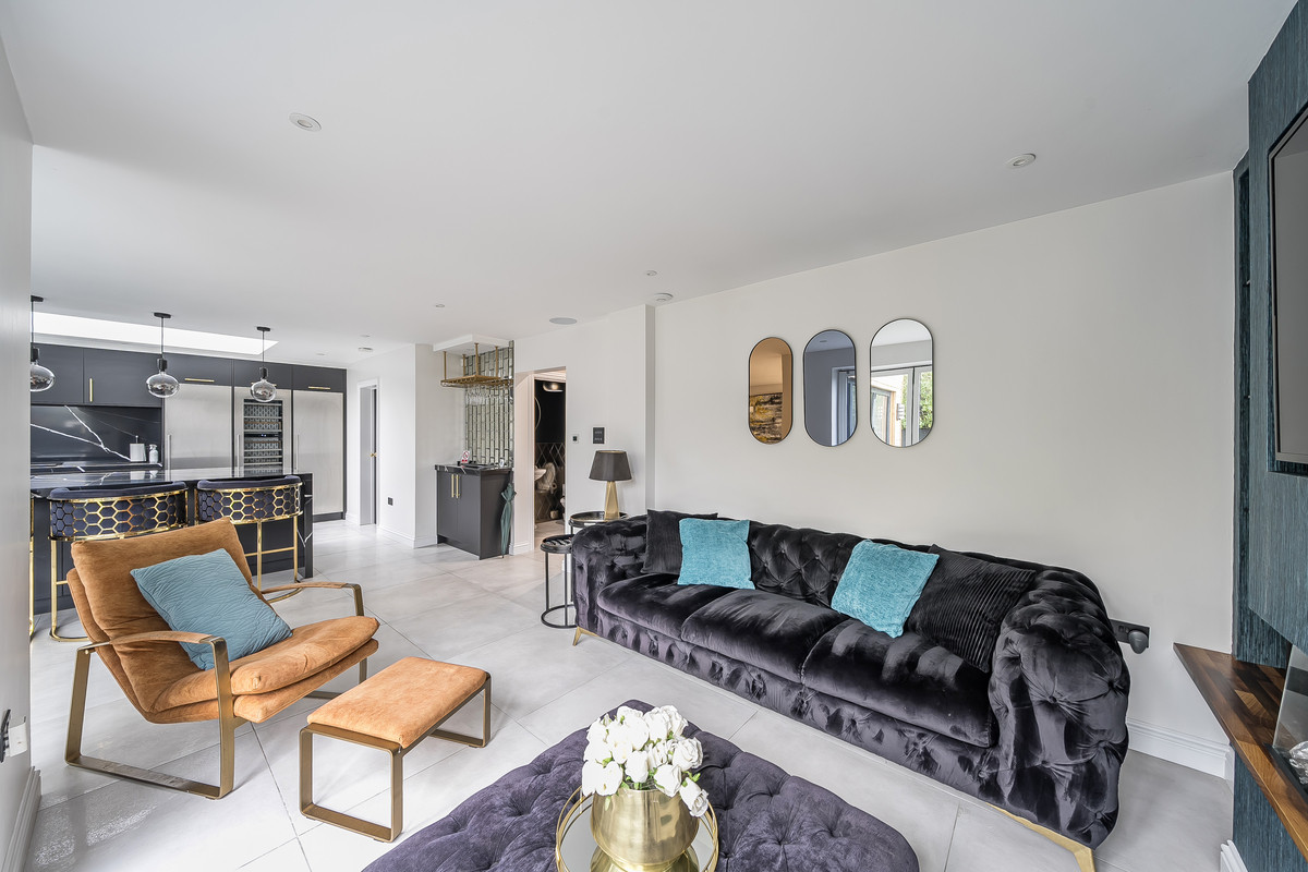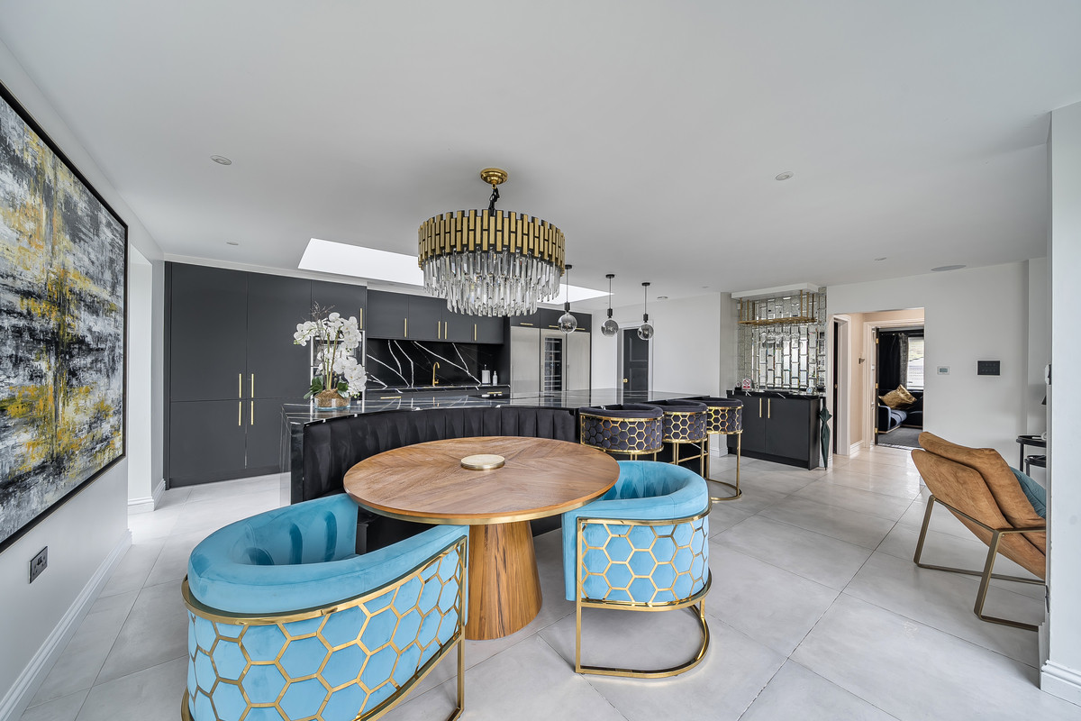 The ground floor exhibits a beautiful interior design revealed first in the three large reception rooms. The first spacious reception room features an open fireplace perfect for cosy family nights and times of relaxation and lounging after a busy day. Down the hallway the second reception room, perfectly designed for home cinema nights, features a modern media wall and electric fire setting the mood for social gatherings bringing the cinema feeling right to your home. The third reception room integrated at the heart of the home features a media wall with an electric fire place tucked away in the beautiful bespoke kitchen. The kitchen, fitted with modern features brings luxury and comfort to all who enter. From heated tiled under flooring, to granite worktops, a fitted seating booth and folding doors to the rear garden, perfect for culinary endeavours, family relaxation and social gatherings.