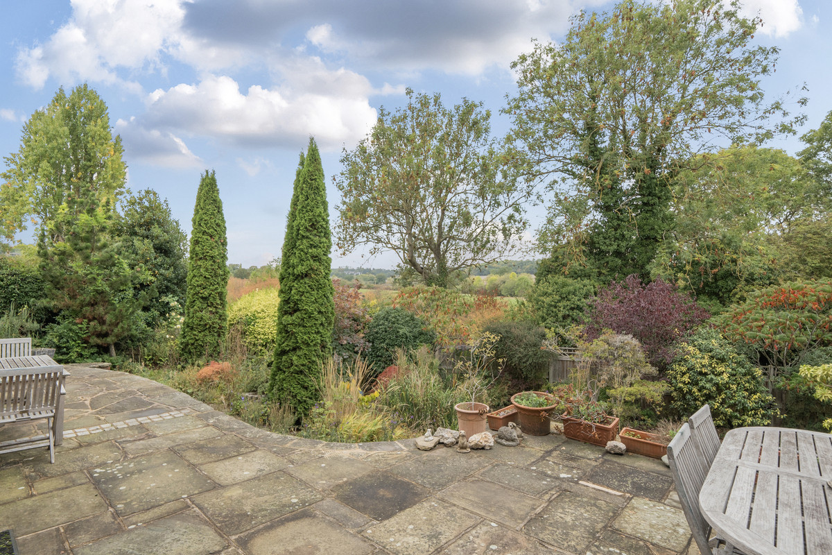 The mature rear garden is a private oasis, with a large terrace perfect for entertaining, leading down to a manicured lawn bordered by lush planting. At the front, a granite block-paved driveway offers off-street parking for multiple vehicles, framed by mature shrubs and trees.