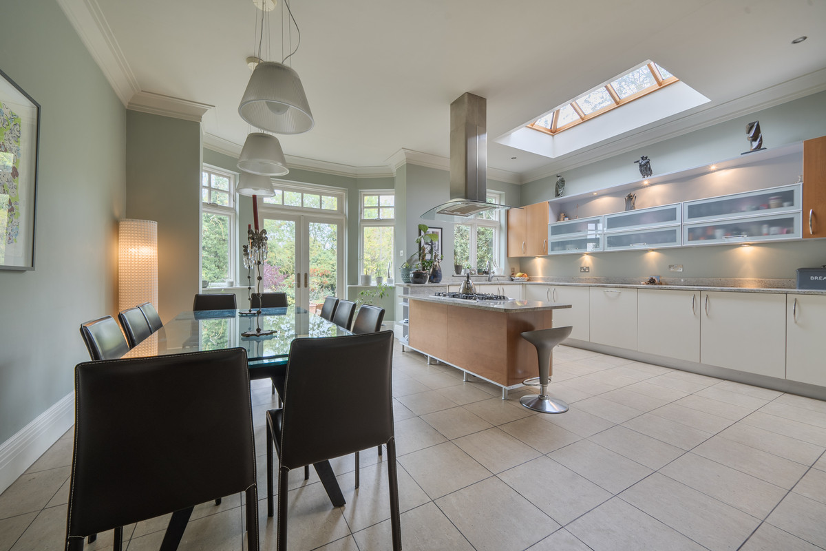 The heart of the home is the open-plan kitchen diner, complete with granite worktops, filtered water tap, integrated Miele and AEG appliances, and a spacious utility room with side access and ample storage.